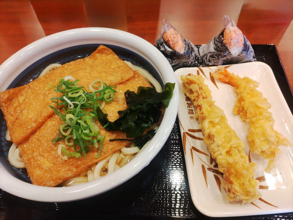 頼んだのは、きつねうどん(得)、ちくわ天、エビ天、鮭おむすび2個。
