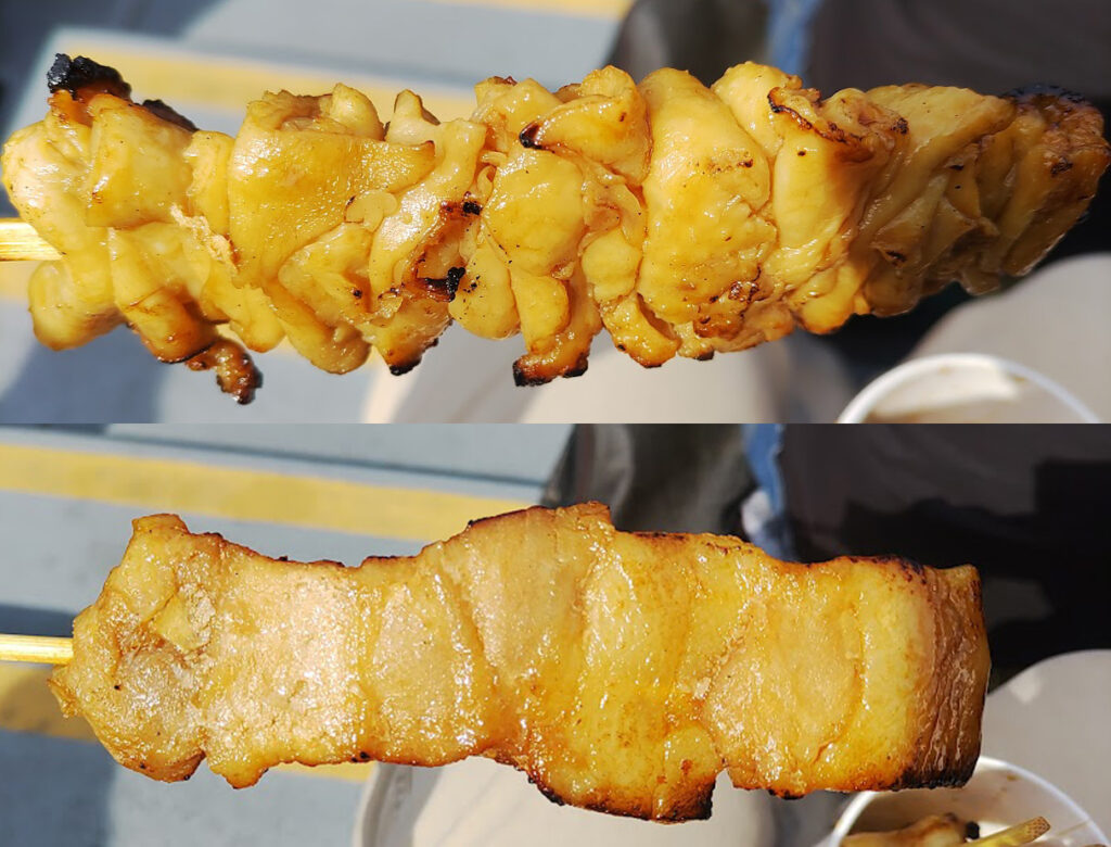 そして、上がジャンボ鶏皮と、下が豚串、2本ずつ購入。
